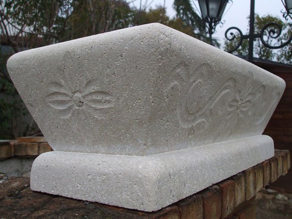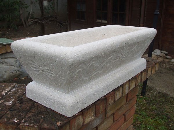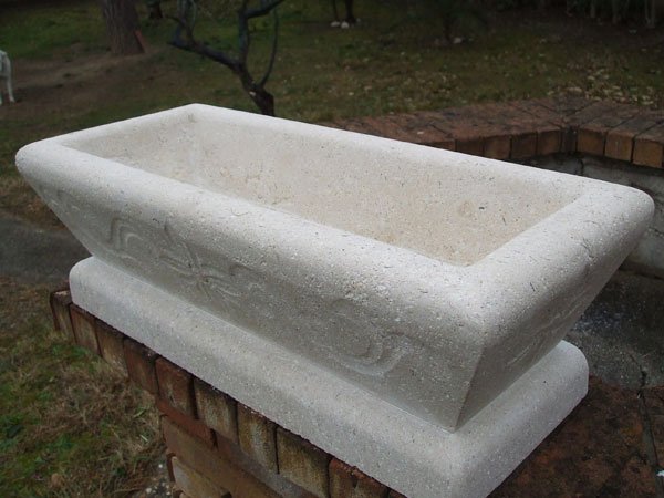 Fioriera in pietra rustica a forma trapezoidale rastremata in basso e incisioni
